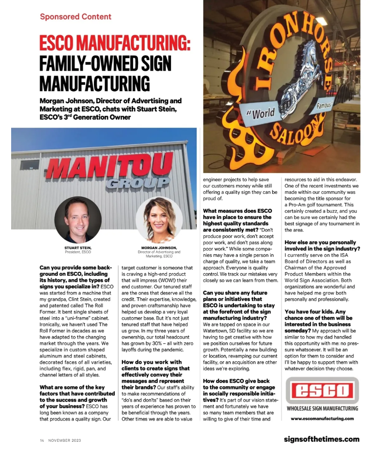Our company has used ESCO Manufacturing for many years for our wholesale electric sign needs. They have manufactured many different types of signs for us over the years. We have had the same sales rep for many years. That says a lot in itself about the company. They have never let us down and always delivered a quality product in a timely manner. They are very competitive and always have great ideas to help us with design and installation. I highly recommend them, they won't let you down