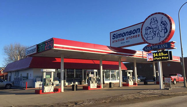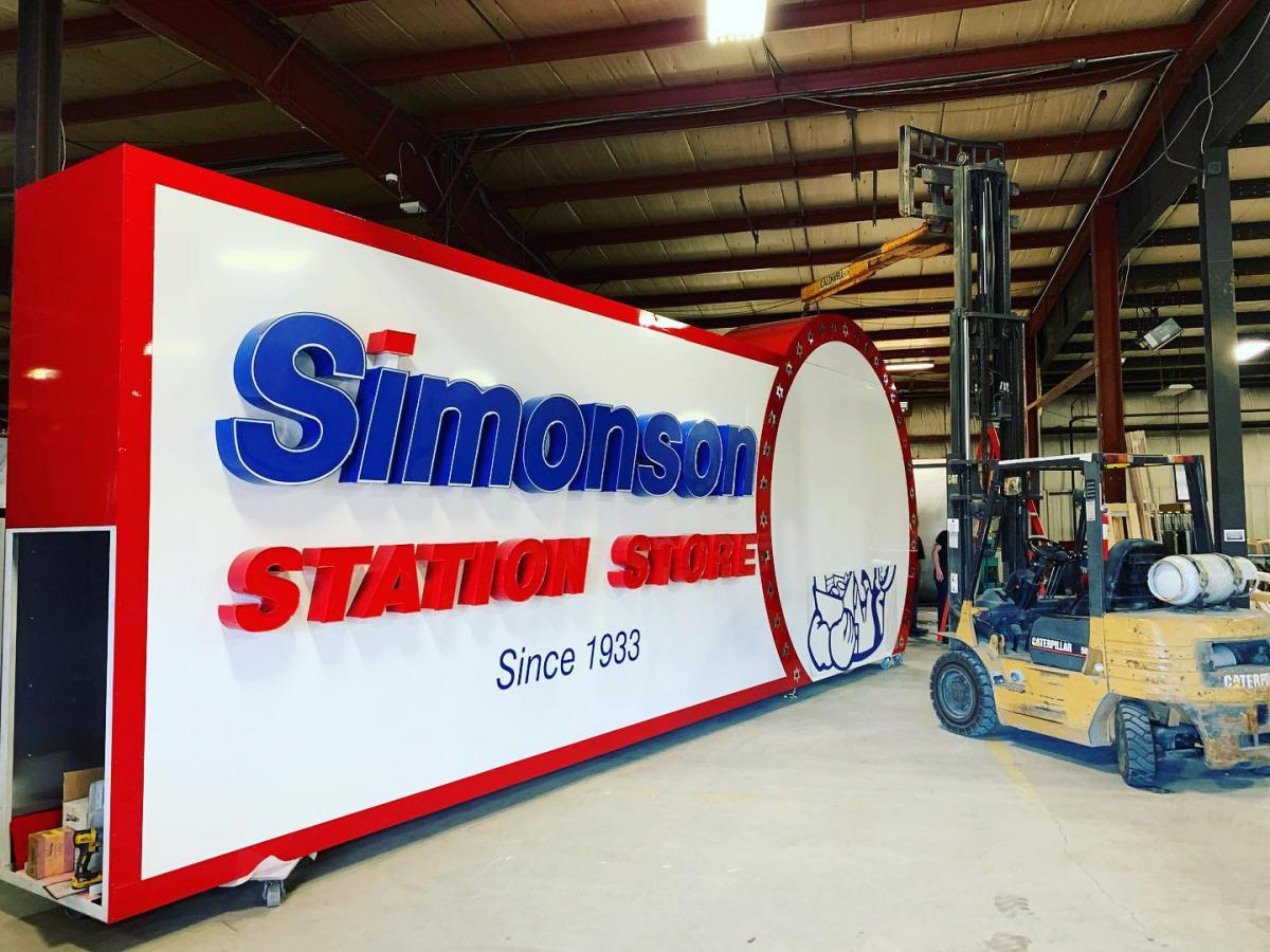 Simonson Station Stores are a regional gas station and convenience store, located primarily in North Dakota and Minnesota. There are currently 16 stores, with more locations on the horizon. Each store is branded with signage in a similar fashion, with the main ID / Pylon sign typically 17' x 32' in size. Channel letters, neon, flashing bulbs, and sign cabinets are all part of this package. See attached pictures.